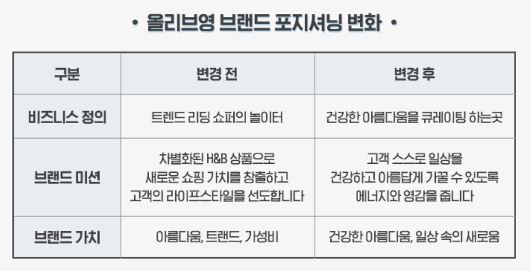 올리브영이라는 이름에는 올리브가 건강을 의미하는 것을 담았고 ALL LIVE YOUNG이라는 의미도 동시에 담았다. 그냥 기름보다 올리브유는 더 좋은 대접을 받고 올리브에서 '더 건강함'이라는 이미지는 금방 떠오른다.