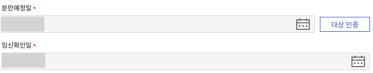 대상인증을 누르면 자동으로 대상 여부를 확인할 수 있다. 분만예정일의 나이가 35세 이상이 되면 인증된다.