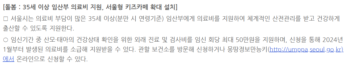 서울시 35세 이상 임산부 대상 의료비 지원사업 내용