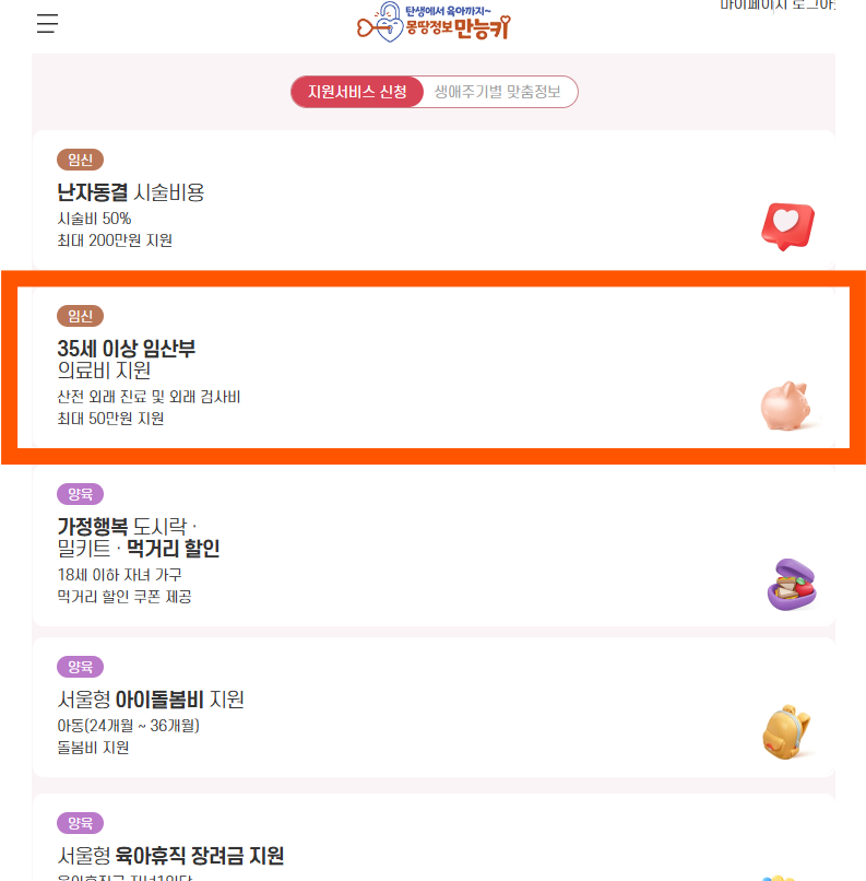 사이트에 접속한 뒤 가입을 해야한다. 가입 후 로그인을 하고 메인으로 돌아와 '35세 이상 임산부 의료비 지원'을 클릭한다.